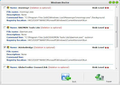 A program osztályozza a találatokat veszélyességi szint szerint. Minél több csillagot kap egy program, annál veszélyesebb, a 2 csillag az nem gond, de persze nézzük át, hogy mik azok amik indulnak a rendszerrel, és amire nincs szükség (toolbar-ok, help pluginok stb…), azokhoz rakjunk egy pipát, ha bármi mellett kettőnél több csillag van, azokat feltétlen jelöljük ki, aztán kattintsunk a REPAIR gombra. A progi elvégzi a takarítást, aztán kattintsunk a FINISH fülre és készen vagyunk.